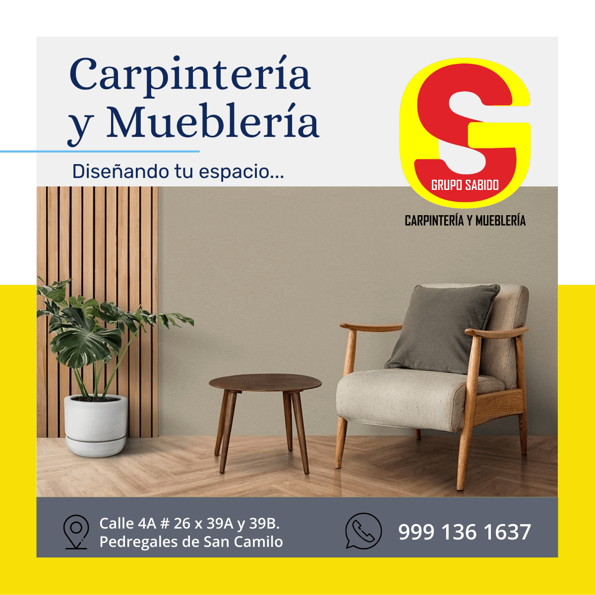 Grupo Sabido Carpintería y Mueblería Previous Next ServiciosCarpintería y mueblería bajo diseñoTeléfono999 136 1637DirecciónCalle 4A # 26 x 39A y 39B. Pedregales de San Camilo 17144